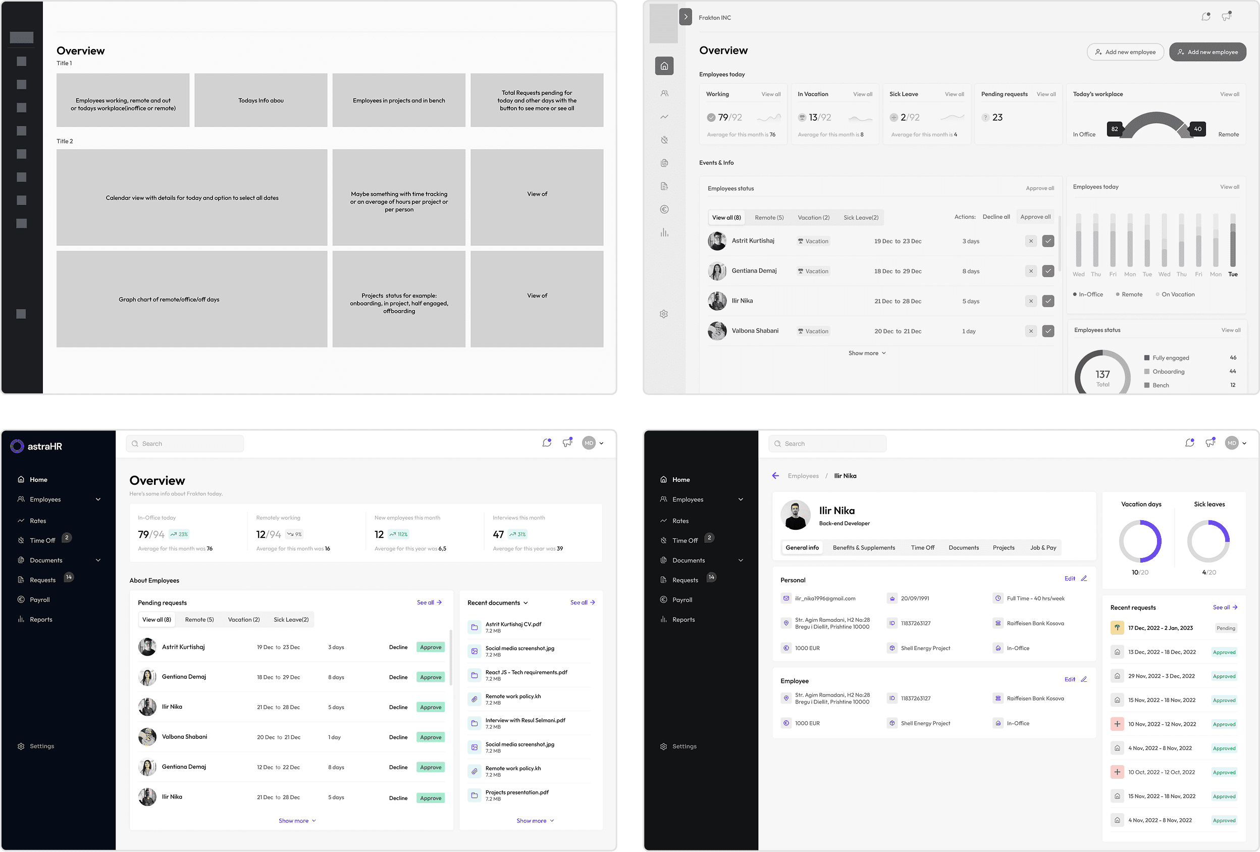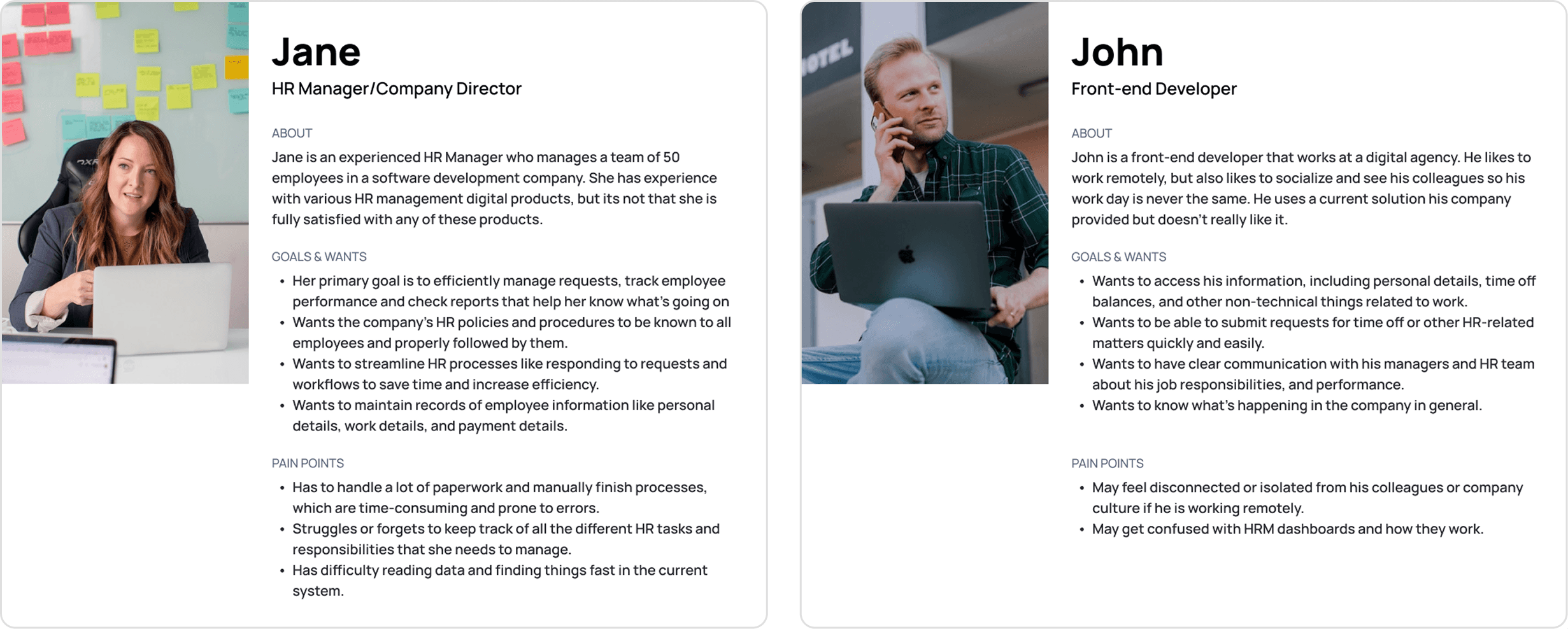 Based on the research, I created two personas that represent my target audience. Obviously the first one and also my priority is the Manager role, including HR Managers/directors, Team Leads, so every one that has a team and wants to see more than just their personal details. The second one is the regular employee, which is limited on features, but is still a key factor for companies since they have far more employees than managers.