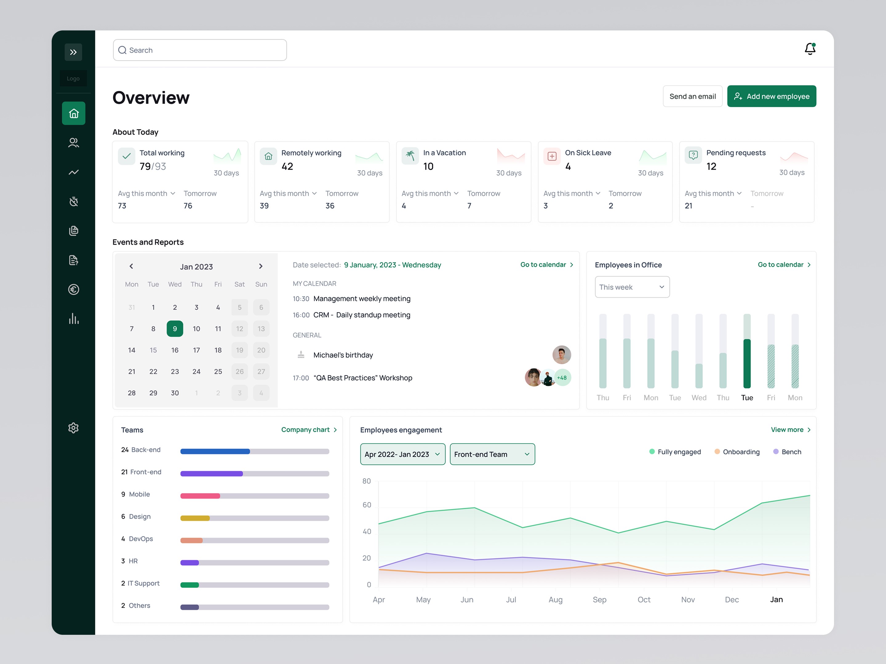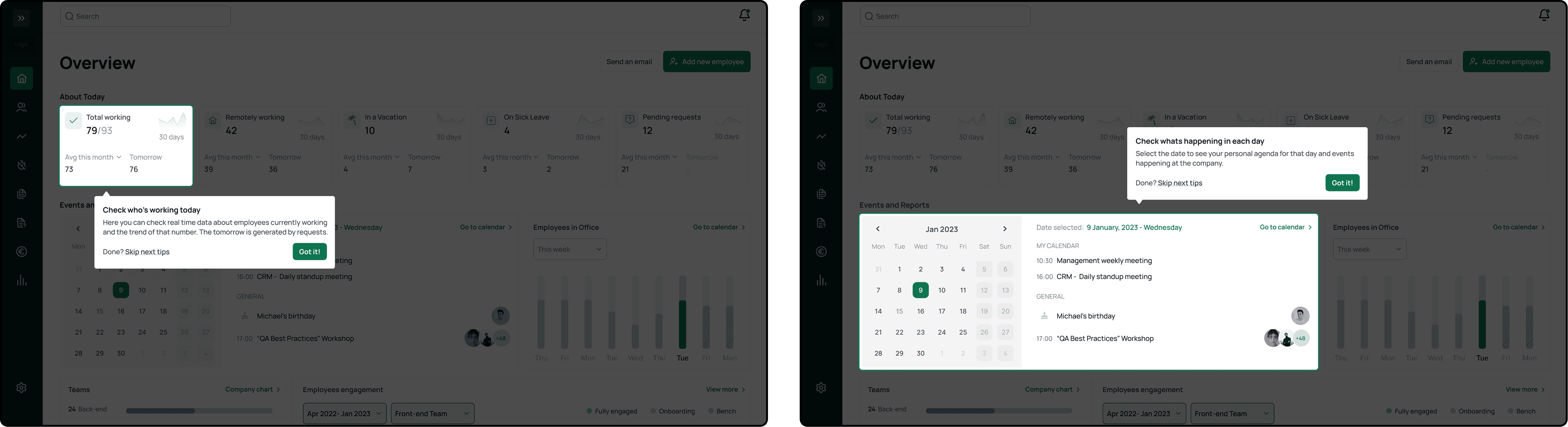 This is the most important page of the product, because users land here, get the first impression and if designed right, they spend most of the time here because they can quickly do things directly and get the information they need without spending time looking into other pages. Here we have the dashboard view from the manager, which has far more features than the employee view.