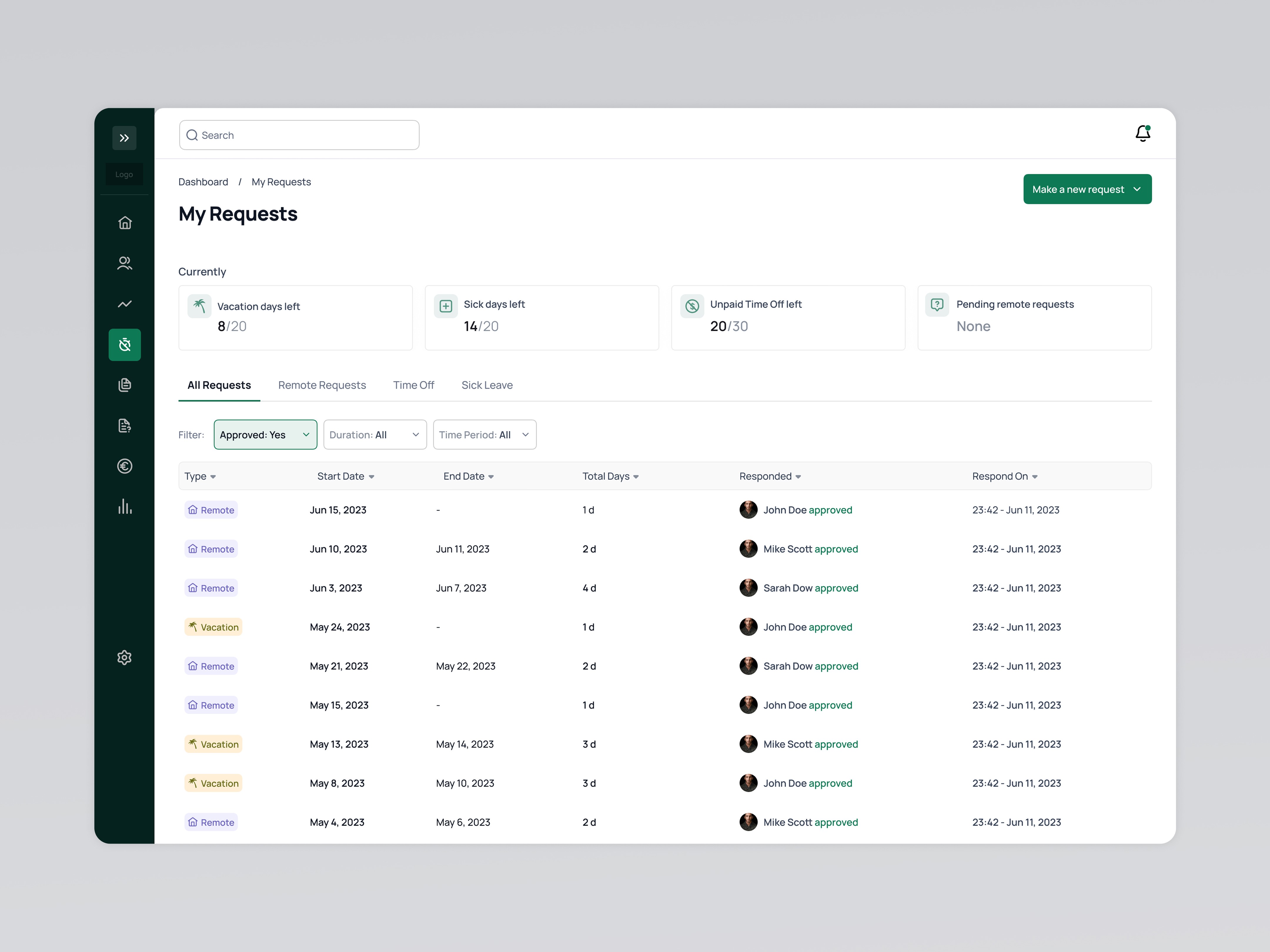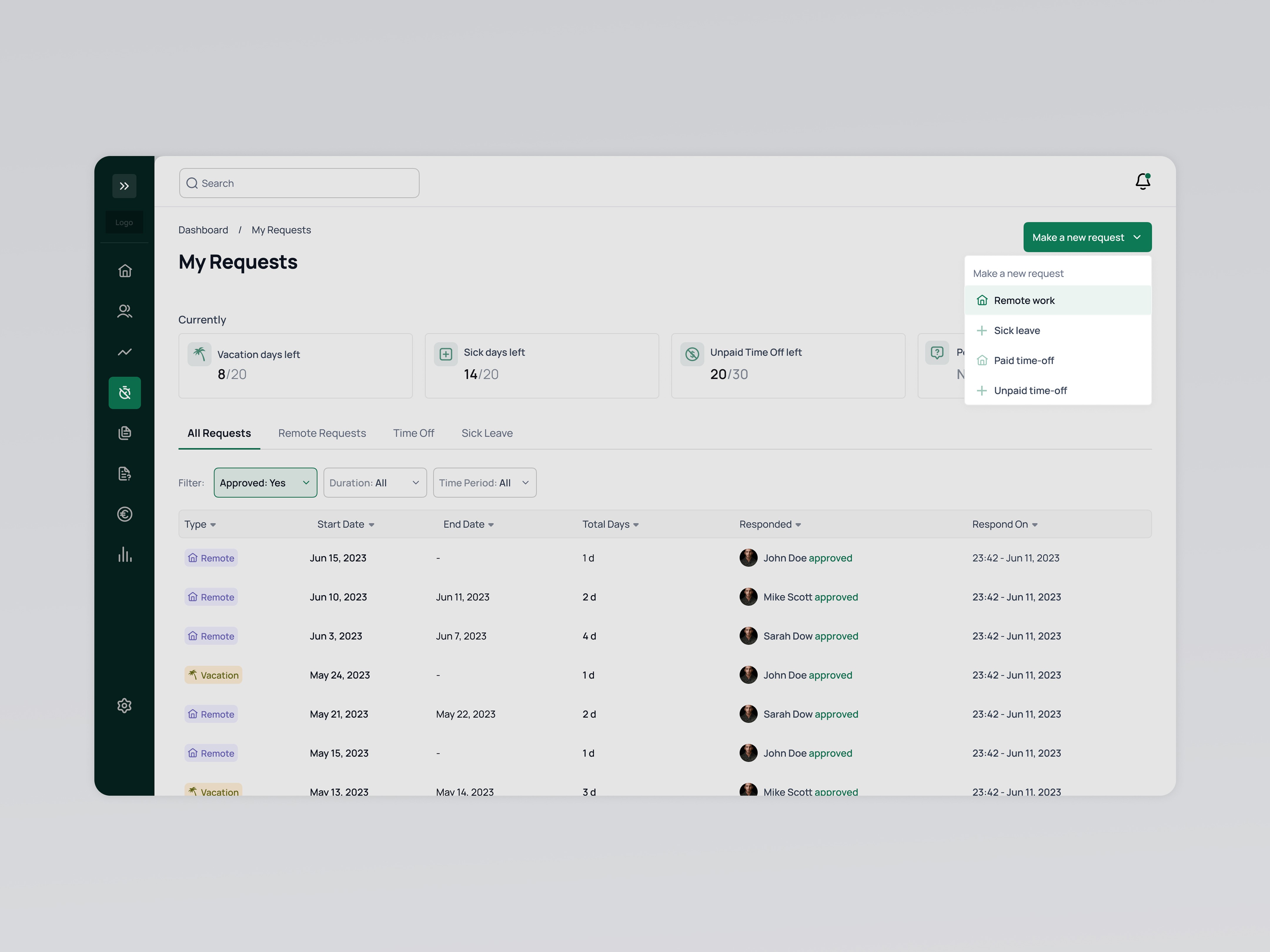 Based on our research, this page is one the most important ones for the employees. Here they can see current status of their remaning days for each type of time-off, number of pending remote requests. They can also switch between request types and see their previous requests and their details, which they can filter by duration, time period or respond. The users can make a new request by clicking the button on the top right corner and choose the type of the request there. After that, a simple modal shows which asks them the dates and a comment about that request.