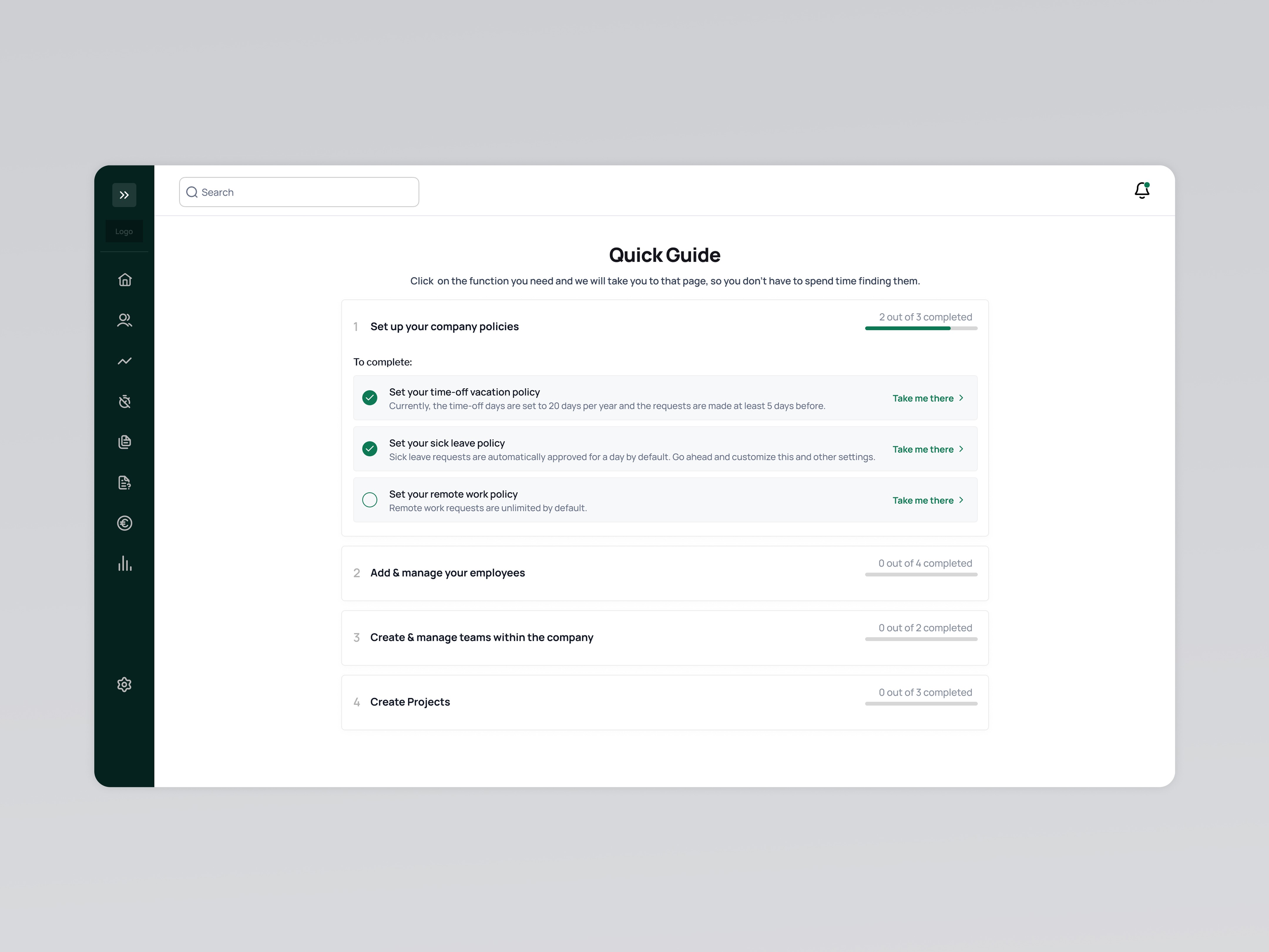 To make it even easier for the users to find things and actions, I decided to create a simple page that I called “Quick Guide”. This page has some steps which are ordered for a better onboarding and understanding of the platform, but they can be clicked even if the previous one are not finished. Each step has the description of the action and a button to take the user there directly.