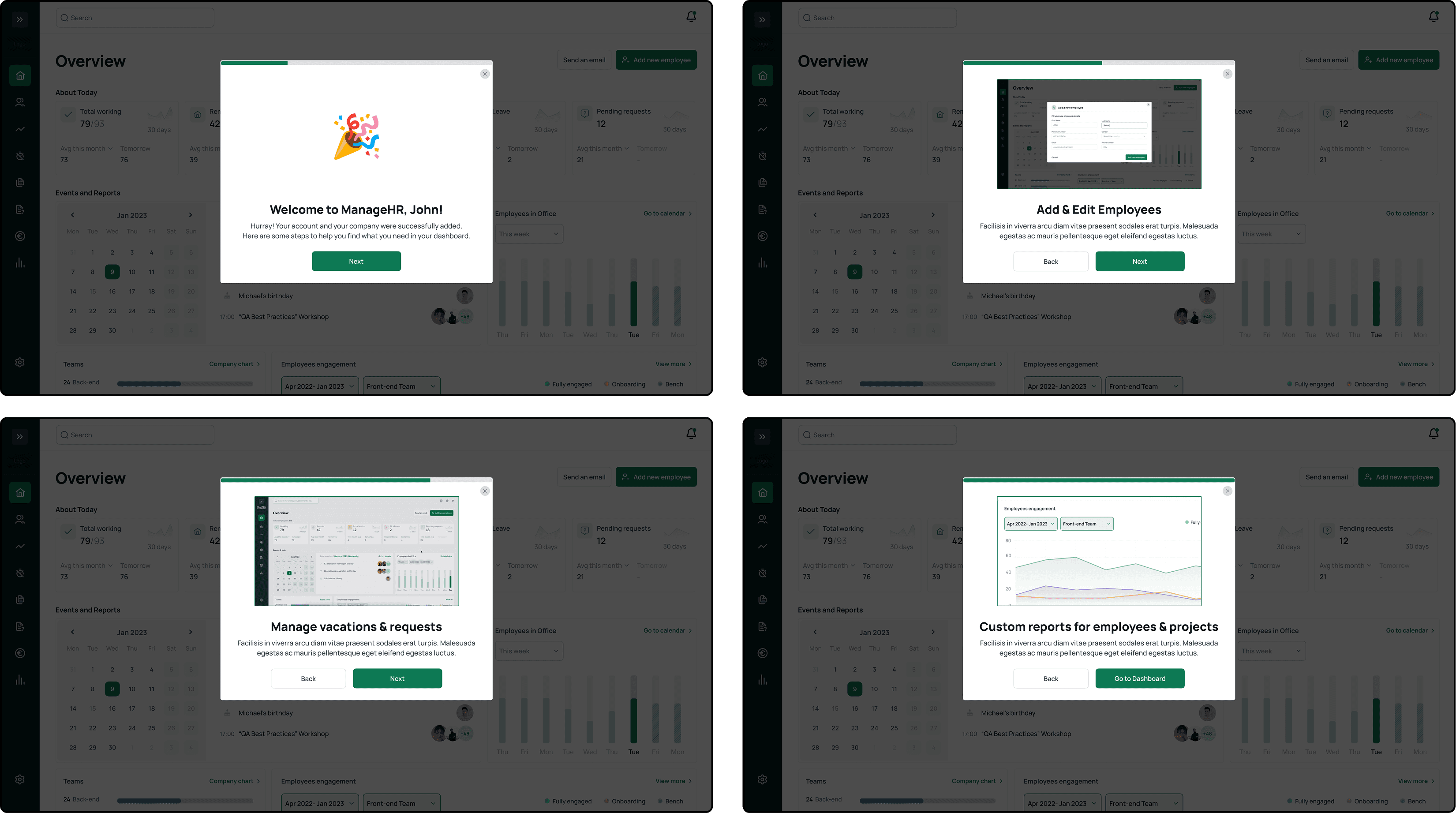 Research says that onboarding is one of the most important parts of a dashboard, if not the most important. In the first pages, I tried to show some of the features, so the user will get how powerful the product is before starting to use it.