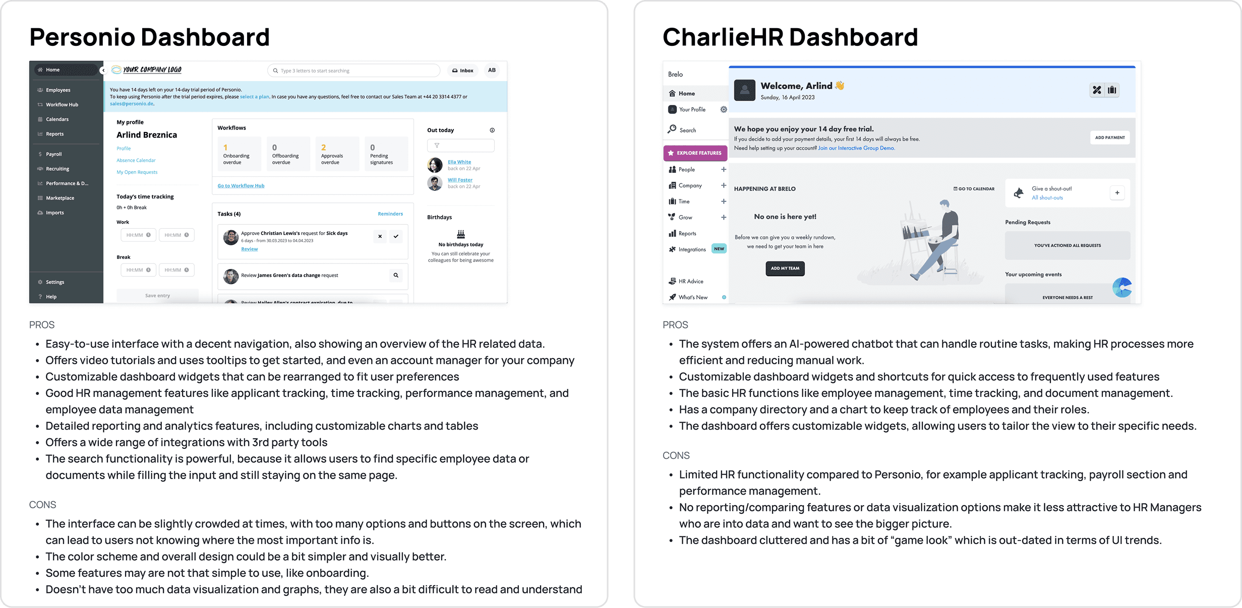 After gathering more info about the target audience, I decided to understand how similar products are designed and what features they have. So I did a competitive analysis on two well known HR management software platforms: Personio and CharlieHR. Even though I didn’t use their dashboards for a long time, it was enough to get an understanding of what their strong points are and if they’re lacking something. Here’s what I found out: