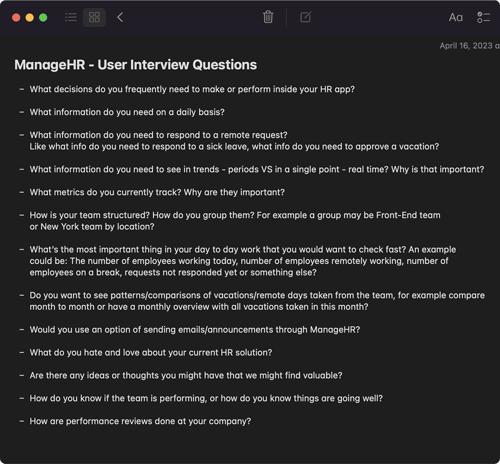 Even though I use a similar product for HR management every day at my job, I wanted to get to know more about how others use these products, understand their needs and pain points so I can build something that will satisfy these needs. I decided to have one-on-one interviews with users that have different roles, but my main focus was on HR Managers and company directors. I interviewed 2 HR Managers, 5 Team Leads, 2 Tech Heads and 4 employees.